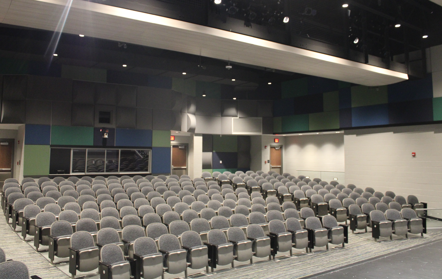 The reimagined stage now features new curtains, flooring, lighting, AV systems, and a catwalk for enhanced lighting control. A fully equipped control room replaces the outdated mechanical-room viewing window, allowing both students and staff to manage productions with ease.