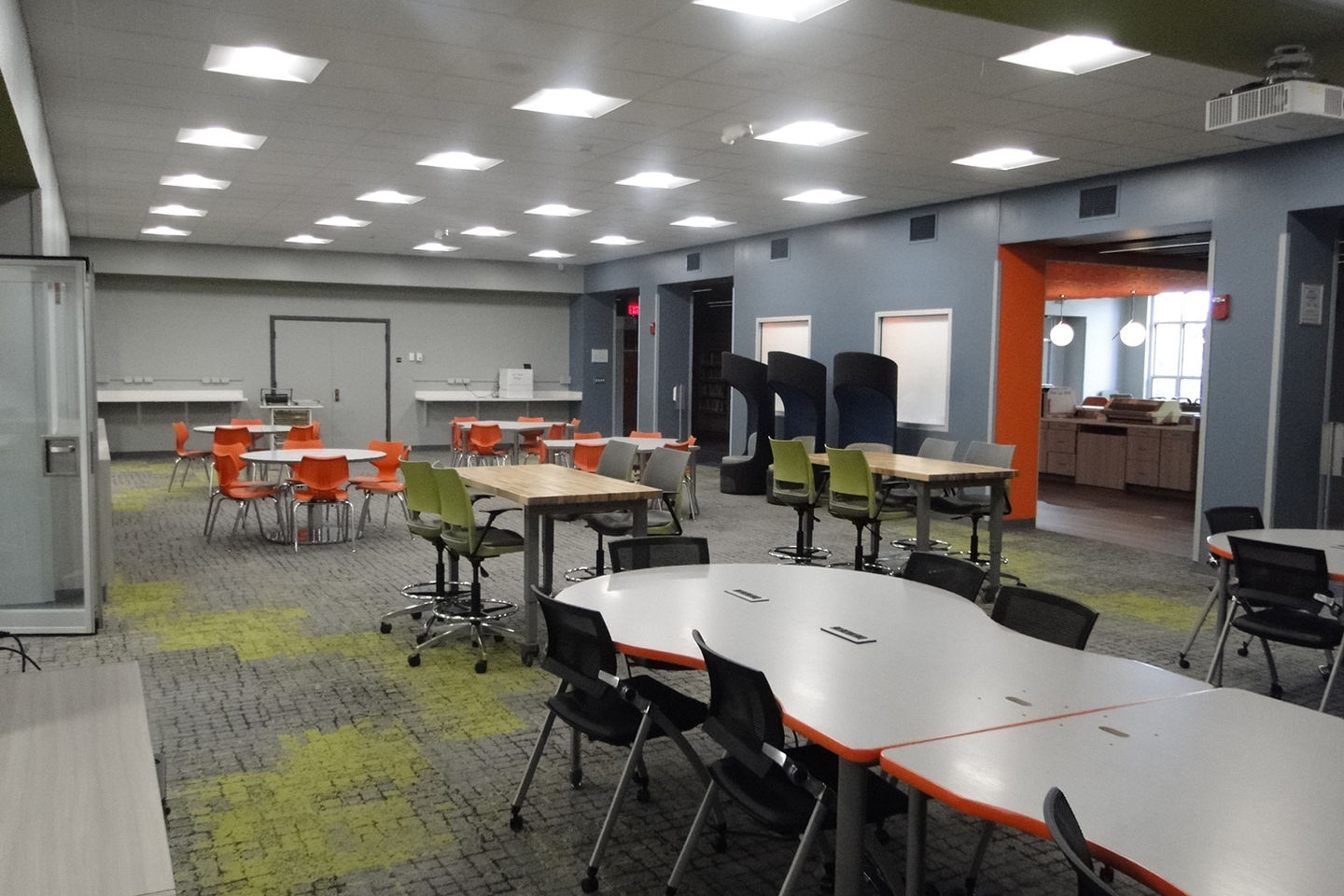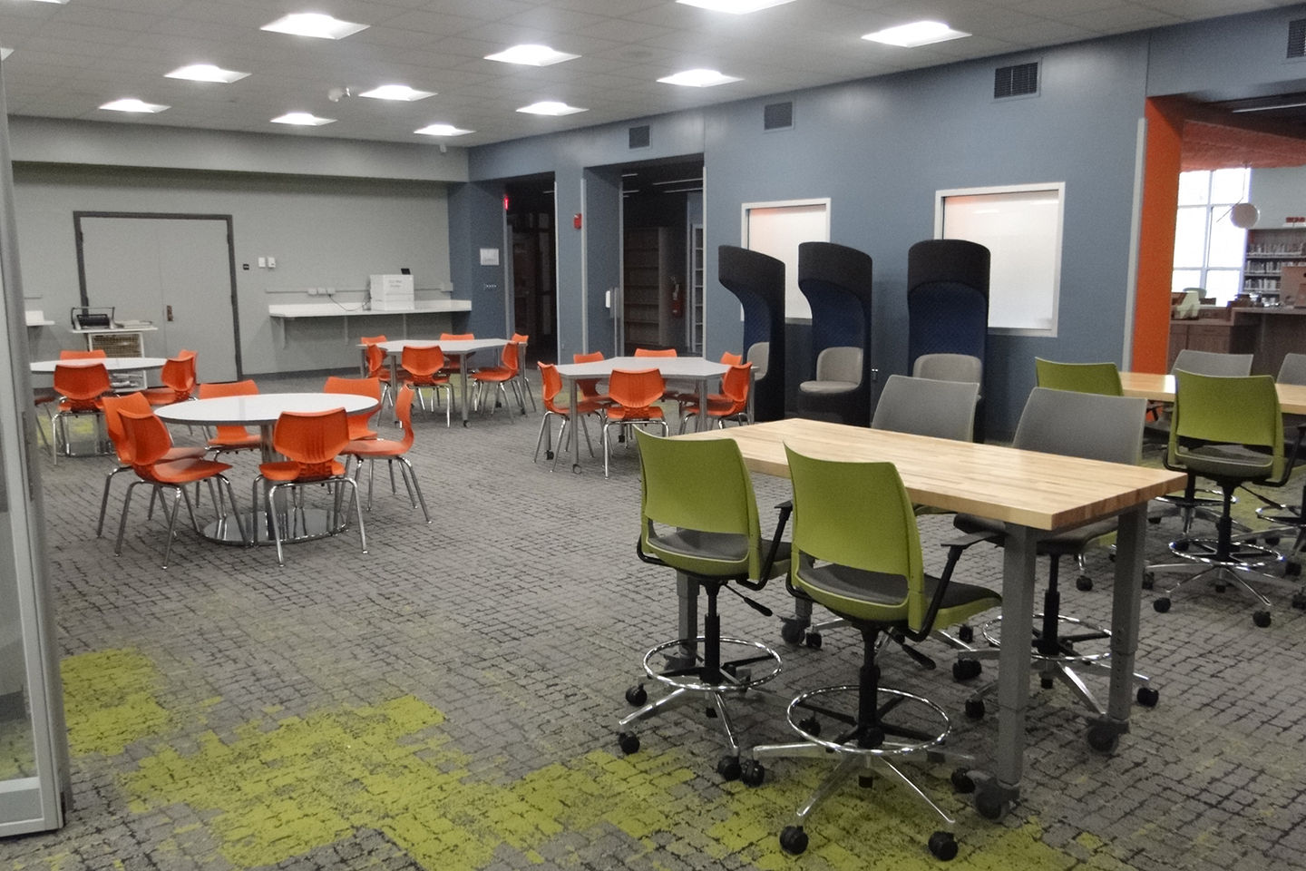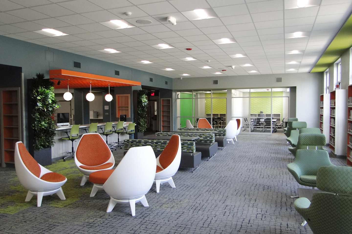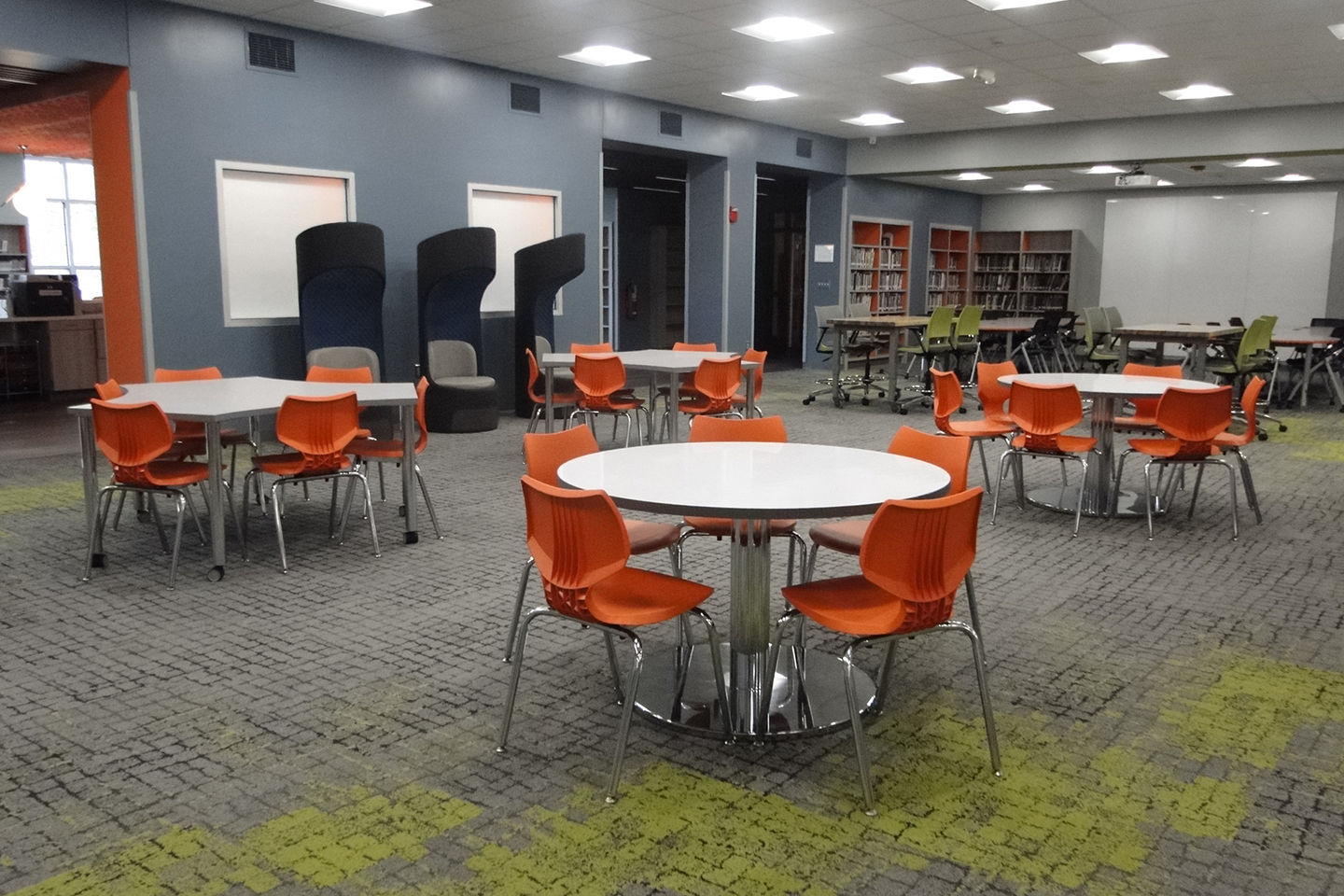The center offers a variety of dynamic spaces, including a large gathering area, help desk, makerspace, flexible seating, extensive book collection, collaboration rooms, and a dedicated staff workroom.