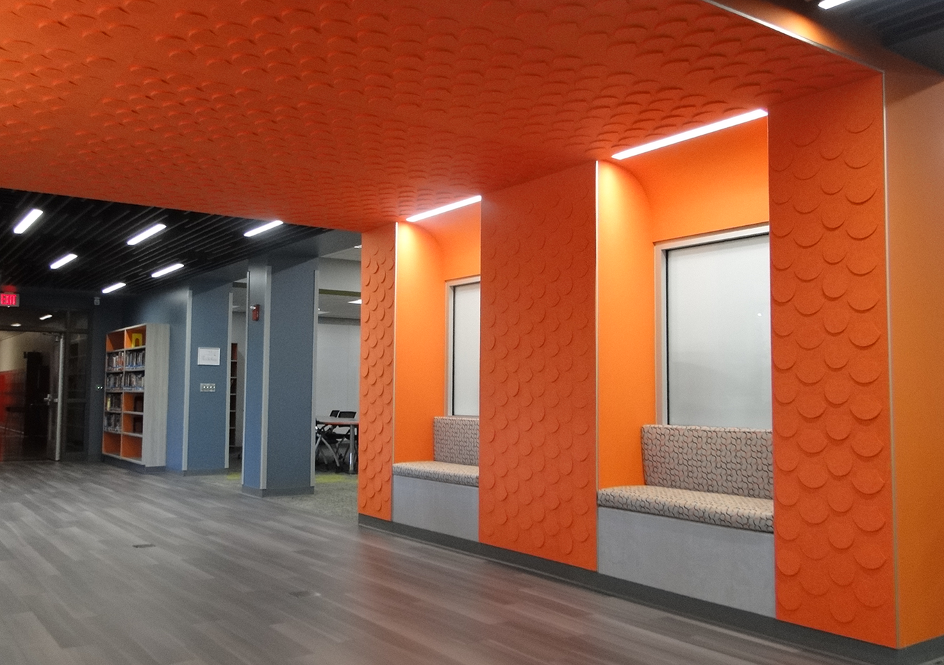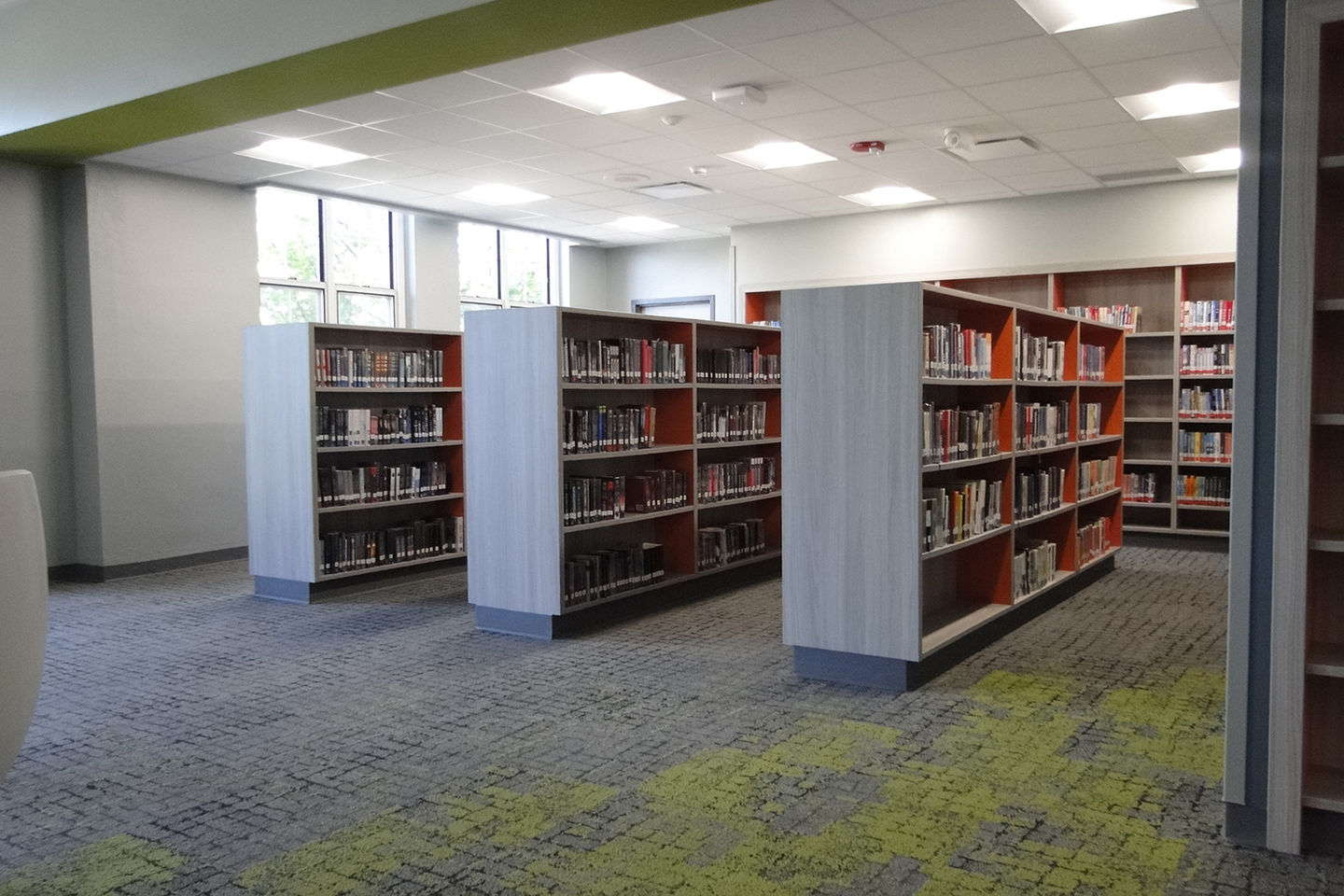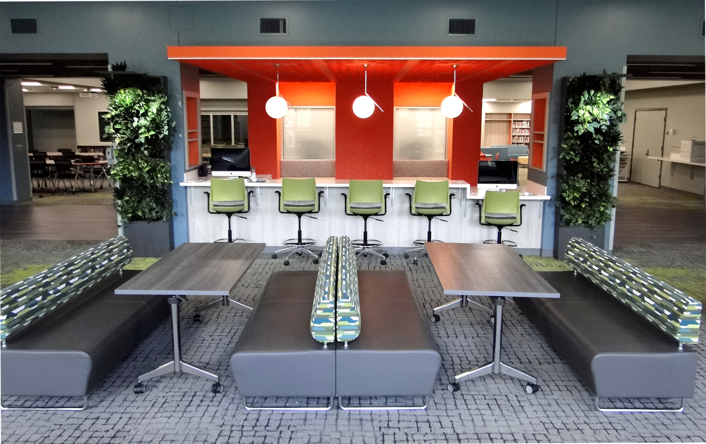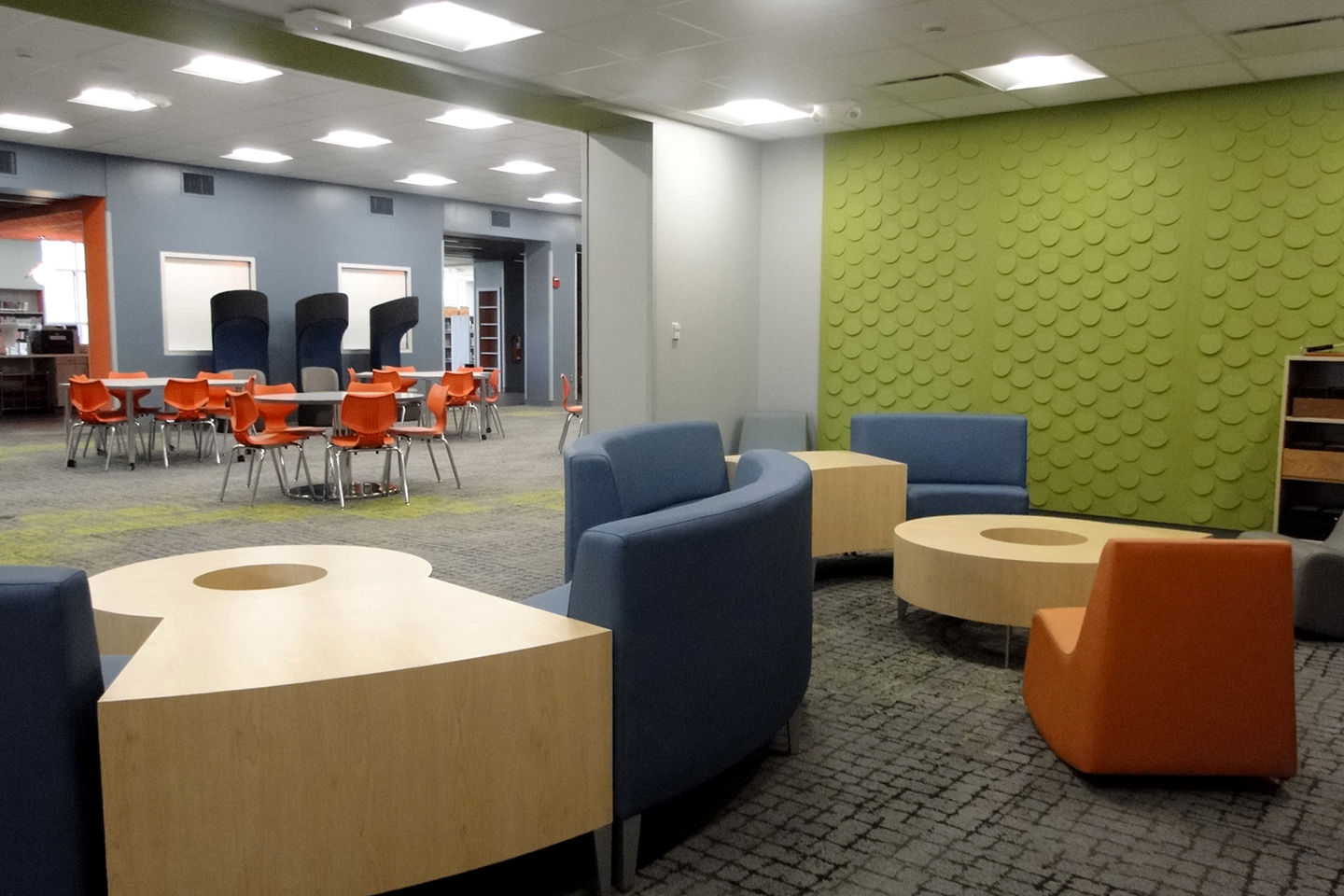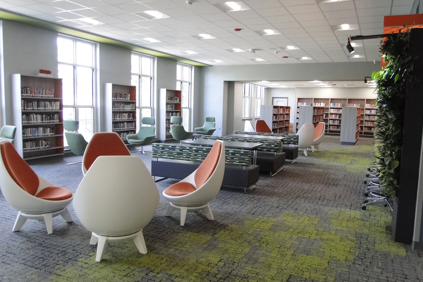 The center offers a variety of dynamic spaces, including a large gathering area, help desk, makerspace, flexible seating, extensive book collection, collaboration rooms, and a dedicated staff workroom.