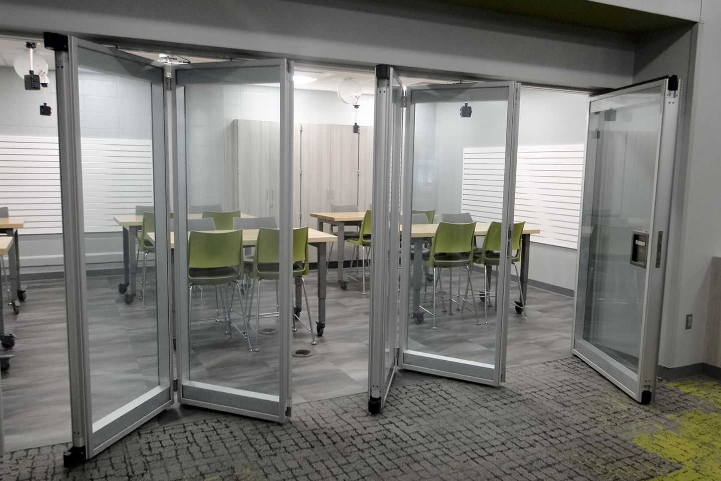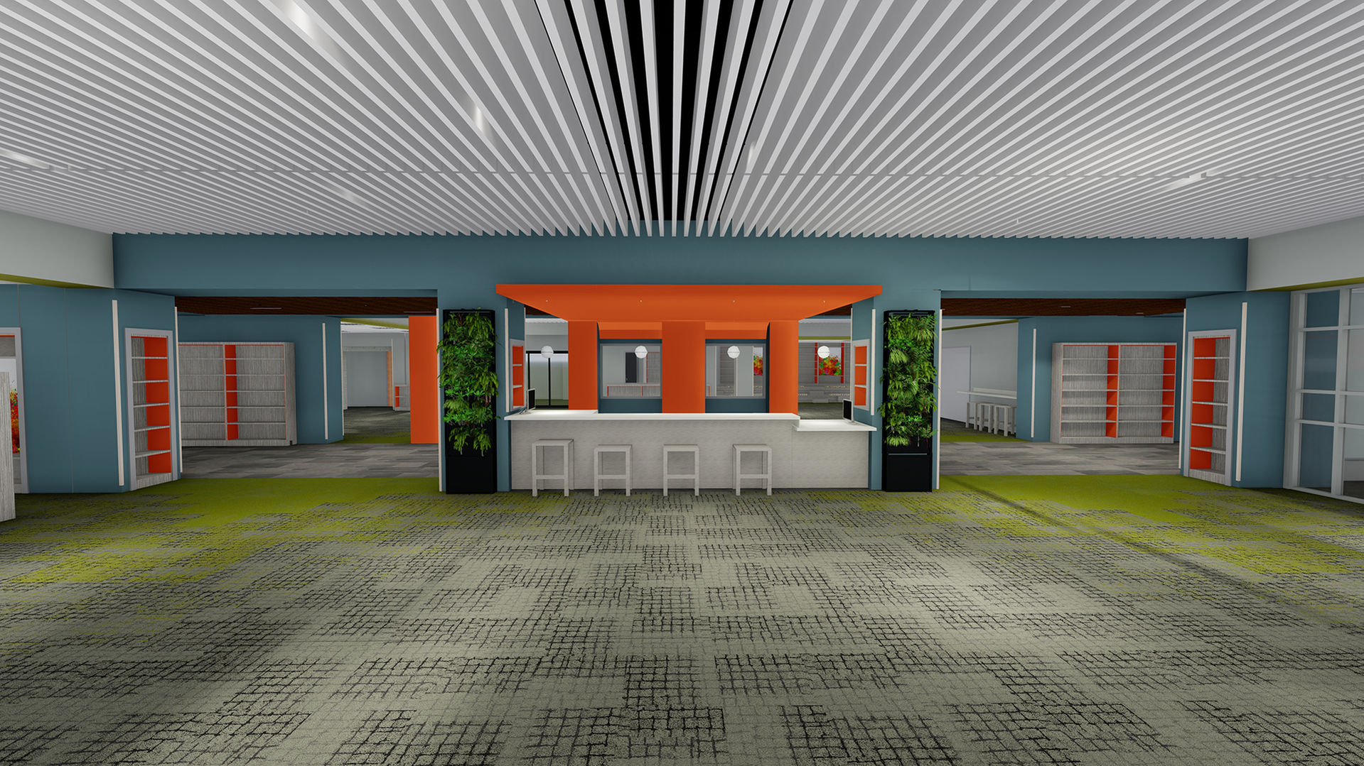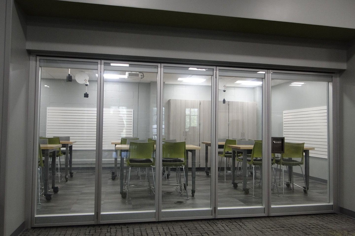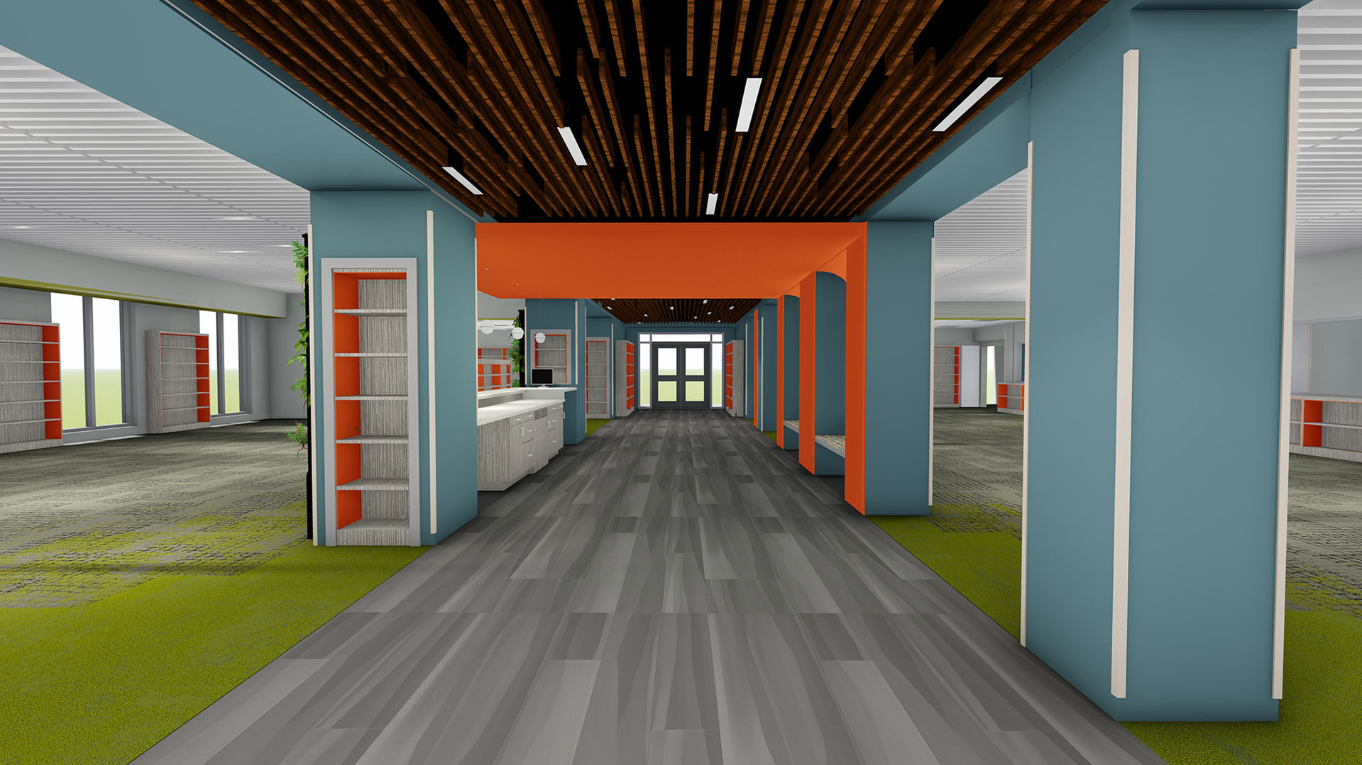 The center offers a variety of dynamic spaces, including a large gathering area, help desk, makerspace, flexible seating, extensive book collection, collaboration rooms, and a dedicated staff workroom.